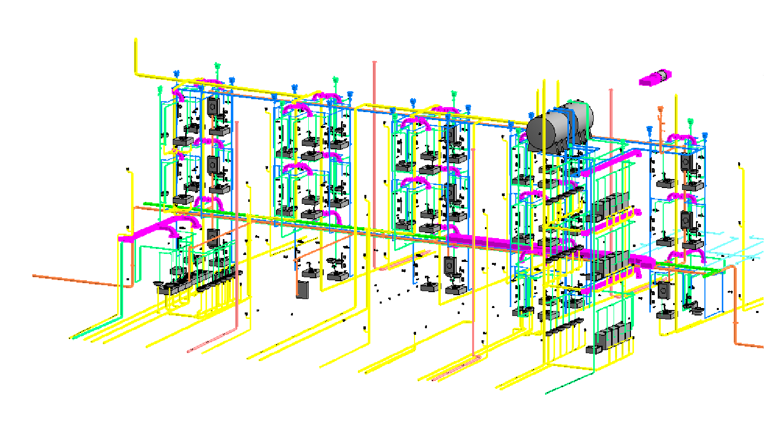 在施工前对机电安装工程进行建模,进行碰撞检查,发现不合理的地方及时进行优化。此模型为海尔日日顺项目的综合楼水电暖管综模型。