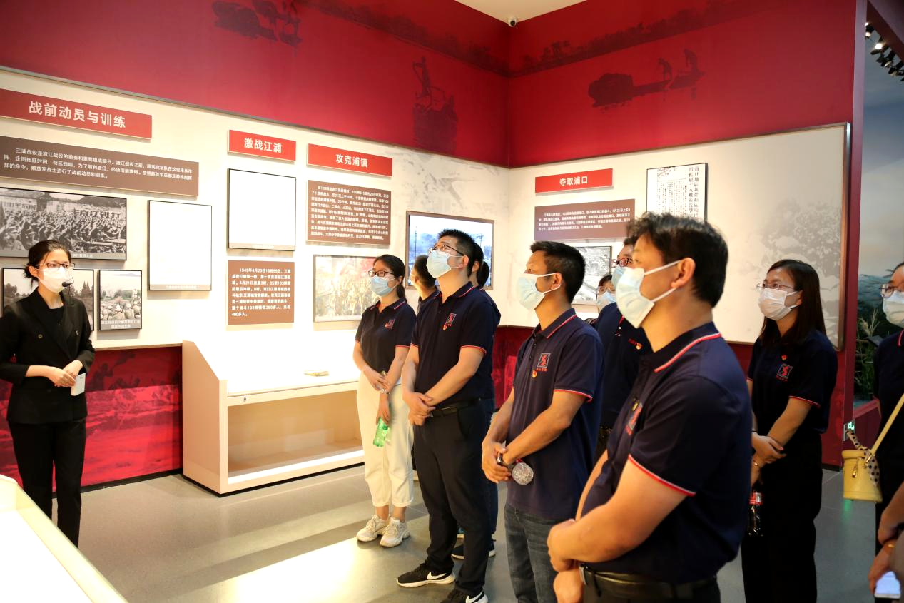 公司党员及项目骨干代表在讲解员的带领下参观和学习江北地区的革命历史,南京江北新区位于江苏省南京市长江北岸,因地处南北交通枢纽,战略位置重要,素有金陵门户的美誉。近代以来,江北人民在中国共产党领导下不断奋起斗争,走过了一段艰难辉煌的革命历程。江北地区是中国共产党在江苏最早建立组织和进行革命活动的地区之一,这里诞生了南京第一个现代产业工会——浦镇机厂中华工会,南京第一个中共党组织——浦镇党小组,南京第一个农村党支部——中共九袱洲支部;新民主主义革命时期仅有的两次中共南京市代表大会也在这里召开。在党的领导下,在以王荷波为代表的革命领袖的带领下,江北人民英勇斗争,不断前行,为中国革命和解放事业,做出了不可磨灭的牺牲和贡献。