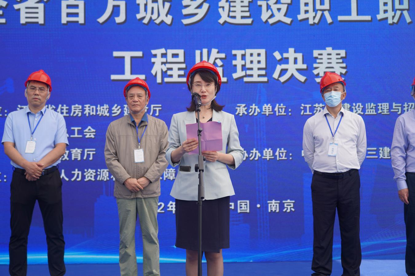 江苏省住房和城乡建设厅副厅长王学锋讲话。她首先对江苏省建设监理与招投标协会和中建八局第三建设有限公司为本次竞赛活动提供了良好的竞赛场地和优质的服务表示感谢。她强调,本次竞赛是我省工程监理行业首次举办的规格最高、规模最大的职业技能赛事,代表着全省工程监理行业最高水平,是全省工程监理人才切磋技艺、增进友谊、提升水平的重要平台。通过开展职业技能竞赛,构建全方位、高层次、多途径的工程监理技能人才培养体系,引导和促进广大工程监理从业人员不断增强学习能力、创新能力、竞争能力,助力工程监理行业人才队伍建设,满足行业高质量发展的需求,为全省房屋市政工程质量提供更强有力的支撑。