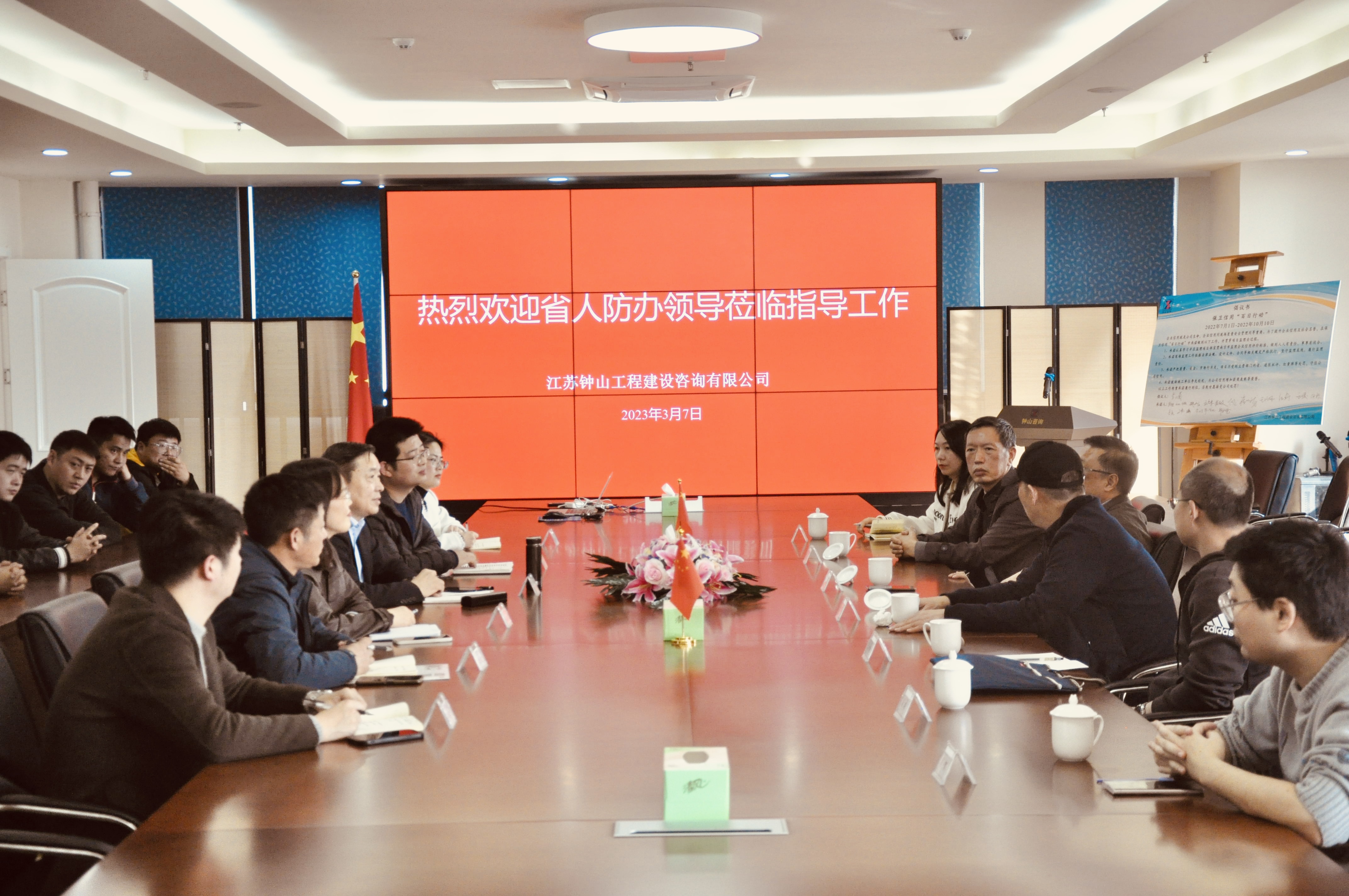 2023年3月7日下午,江苏省国防动员办公室一级巡视员沈斌、设施管理处处长李治国,江苏省人防协会会长李洪忠、人防协会秘书长吕琰、人防协会监理分会秘书长王俊岭一行人到江苏钟山工程建设咨询有限公司调研人防监理工作情况,公司领导及办公室等人员参与接待。