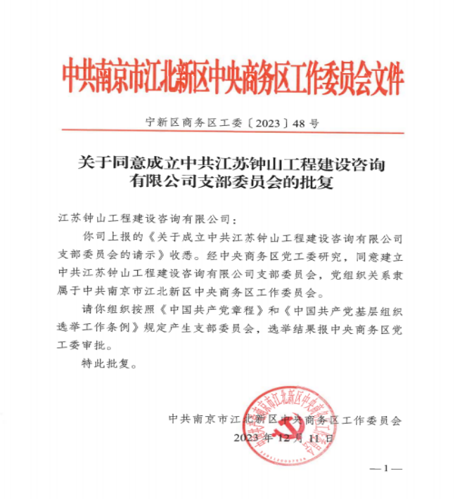 为加强企业基层党组织建设,发挥党组织战斗堡垒和共产党员的先锋模范作用,经过公司的筹备、申请,2023年12月11日,中共南京市江北新区中央商务区委员会同意批复江苏钟山工程建设咨询有限公司支部委员会成立。